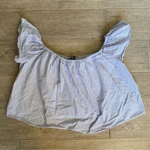 Blue and White Pinstripe Off the shoulder top from ZARA. Elastic inner lining. There are two very, very small stains in the front that can barely be seen (they are pictured). Otherwise in good, used condition.