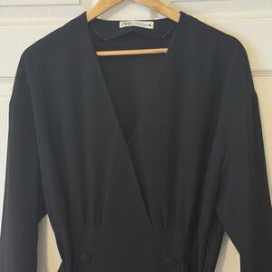 Chic black midi dress by Zara featuring a wrap-style V-neck, double-breasted front buttons, and a belted waist for a flattering fit. Made from 100% polyester with a concealed side zipper and front double slit. Perfect for work, events, or evenings out.