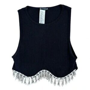 ZARA Black Contour Hem Ribbed Cropped Tank with Rhinestone Fringe Hem