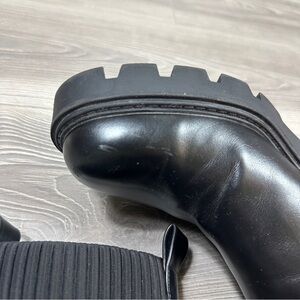 Ships fast from North Carolina! These Zara black lug sole boots bring serious edge. With ribbed knit panels, a chunky block heel, and minimal design, they’re ready for fall layering, winter holidays, and Pinterest-worthy cold-weather outfits. They've been worn but show barely small signs of wear — ultra durable and stylish. Fall 2025 trend: Tough Girl Texture meets Urban Minimalism.