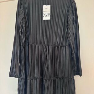 Elegant black pleated short dress. Black sheen silky and long sleeves. Good basic black dress. Never worn.