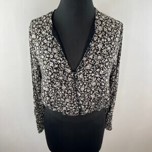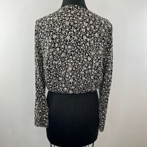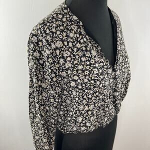 ZARA Black White Floral Print Chiffon Button-Up V-Neck Long Sleeve Crop Top M