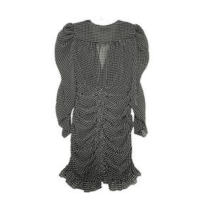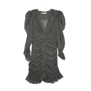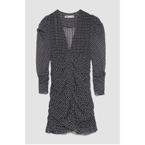 Zara Sheer Black & White Pattern All Over. Ruched Mini Dress. Slight LIned Waist Down. Puff Shoulders, Long Sleeves. Deep V-Neck. Silhouette Fit. Hidden Side Zipper. Ruffle Hem.