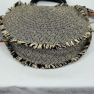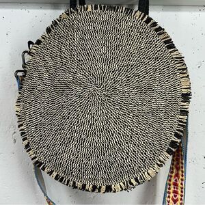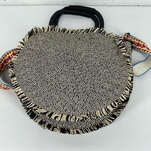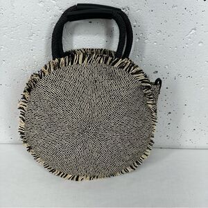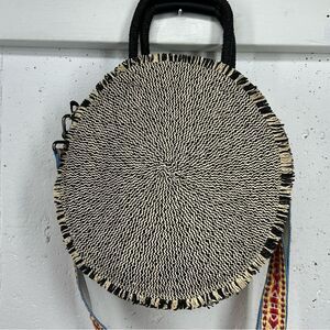 ZARA Black and Cream Woven Straw Round Hand Tote Crossbody Bag. Not original cross strap this one is off a SAKroots hardware is silver bag is gold. Besides that in good preowned condition clean 12 x 12 x 4 inches
