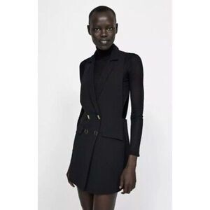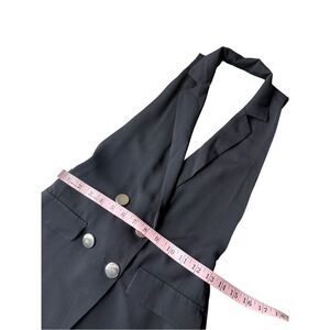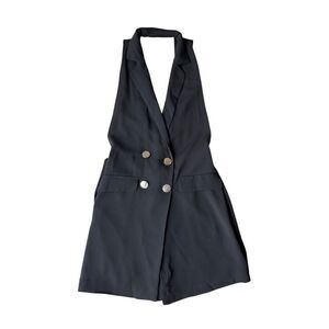 Elevate your wardrobe with this stunning ZARA black playsuit romper, perfect for chic day-to-night transitions. This sleeveless, tailored design features a lapel collar and a sophisticated double-breasted front closure with gold-tone metal buttons and an interior button for a secure fit. The romper has a flattering, flowy short silhouette and elegant faux front flap pockets for a structured look. The low-cut back with thick straps adds a stylish twist, ideal for layering or wearing solo.