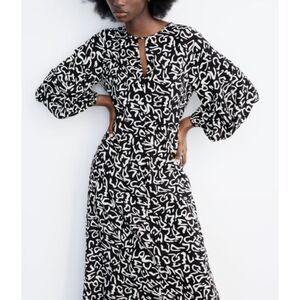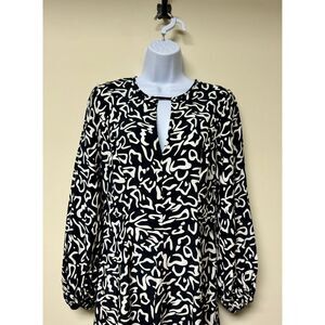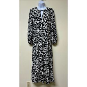 Like new condition with no signs of wear. Full midi, possibly maxi dress depending on height of wearer. Black and white abstract print. Keyhole front. Hidden back zipper. Long sleeve. 100% viscose.