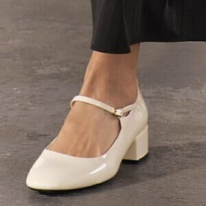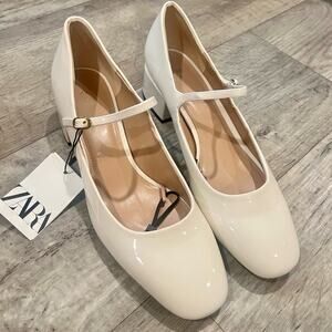 Off-white mary Jane style shoes with faux patent leather. Block heels. Ankle strap closure. From ZARA, in US size 10 (EUR 41). New with tags. Sold out in stores.