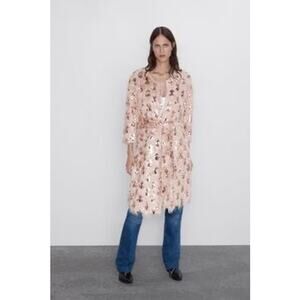 ZARA Blogger FAV NUDE BEIGE PINK SEQUINNED COAT KIMONO FRINGED WITH BELT