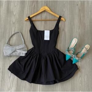 Chic black A-line short dress featuring a square neckline, wide straps, and a flattering pleated waist. Hidden in-seam pockets and a sleek silhouette create the perfect elevated casual look for daytime events, date nights, vacations, and blogger-inspired outfits. New with tags and sold out in stores.