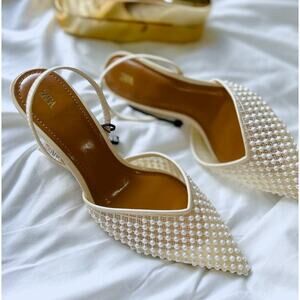 🤍 **ZARA Blogger Fave!** Elegant, feminine, and ultra-glamorous — these pearl-embellished slingback heels make every outfit look luxe.