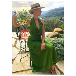 A statement in effortless elegance — this ZARA green V-neck long dress is crafted from a breezy linen-blend fabric with a halter-wrap neckline and adjustable tie belt. Flowy, flattering, and perfect for warm-weather events, vacations, brunch, and everyday polished style.