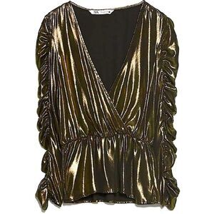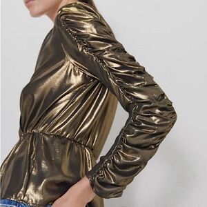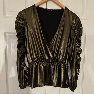 Zara Metallic Top Gold Lame’ Wrap Front Shirt Ruched Sleeve Blouse Size Small