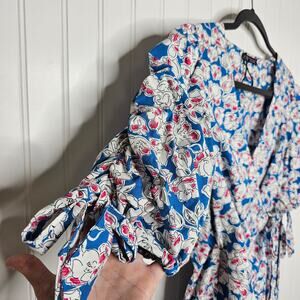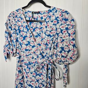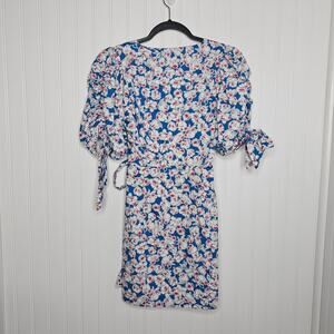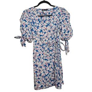 ZARA Blue Floral Printed Poplin Wrap Dress Size XS Bow V-Neck Mini Date Flirty