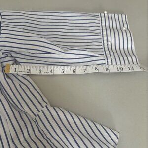 Adorable and chic, this ZARA button-down shirt features classic blue and white stripes with elevated details: a flattering peplum back and pearl accents on the sleeves. The silhouette is feminine and tailored, making it perfect for workwear or brunch. A stylish twist on a timeless piece!
