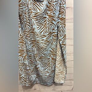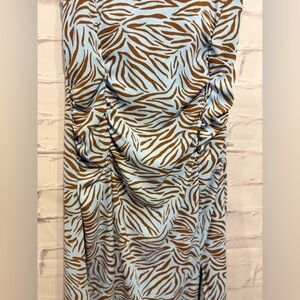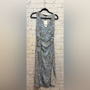 Details: NWT, wide straps, gathered detail, front slit, bold animal print, midi length.