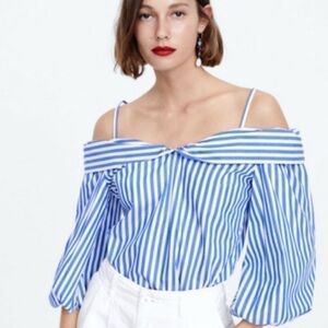 ZARA Blue and White Stripe Off Shoulder Top with Collar SZ XS coastal preppy