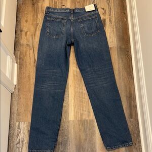 These blue straight-leg jeans feature a medium-dark wash with a slightly faded, worn-in look, offering a classic and versatile style. The denim's subtle variations add depth and character, making them a timeless addition to any wardrobe. Perfect for casual outings, these jeans provide both comfort and style.