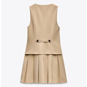 Sleeveless V-neck mini dress. Front false welt pockets. Back strap detail. Box pleats at hem. Interior lining. Front button and side hidden in-seam zip closure.