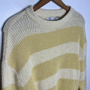 Cozy and chic Zara oversized knit sweater in a stylish yellow and white striped pattern. This long-sleeve crew neck sweater offers a relaxed and comfortable fit, perfect for layering or wearing on its own.