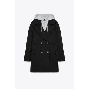 Coat with a detachable combined hoodie featuring button fastening. Long sleeves with inner cuffs. Front double welt pockets. Double-breasted front fastening with zip and buttons.