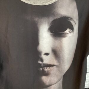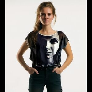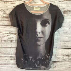 Zara Collection, size S, gray top, short sleeves, face print, excellent pre owned condition. Approximately measurements: Ptp 18" Length 24 ".