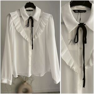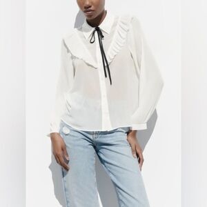 ZARA CONTRAST BOW SHIRT WHITE SHEER LARGE NWT