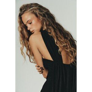 V-neck midi dress with cold shoulders. Matching scarf-style fabric trim. Side zip fastening hidden in the seam.