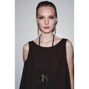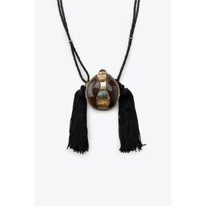 Double intertwined cord necklace with matching pom-poms. Metal box pendant with inlaid colored piece and stone detailing. Lobster clasp closure.