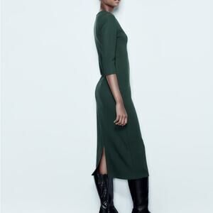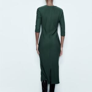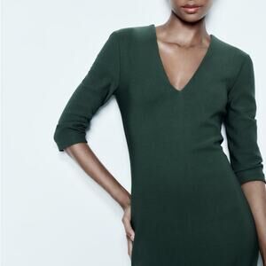 Midi dress with V-neck and below-the-elbow length sleeves.
