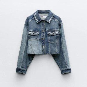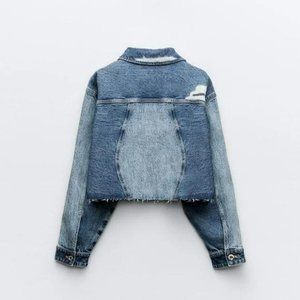 Jacket with lapel collar and long sleeves. Ripped trim detail. Front patch pockets with flaps. unfinished hem. Washed effect. Front metal button closure.