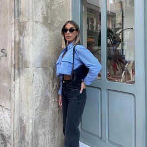 Short shirt made of gabardine style fabric with lapel collar. Long sleeves with slit cuffs. Front flap patch pockets. Front button closure.