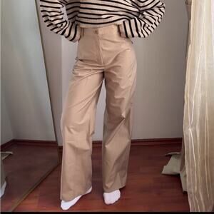 Pants made of cotton blend fabric. High rise with belt loops. Pronounced tonal topstitching detail. Wide leg. Front zip and button closure.