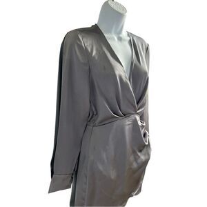 ZARA Charcoal Gray Satin V-Neck Longs Sleeve Wrap Mini Dress In Size XS