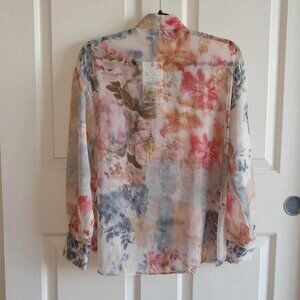 Elegant and feminine! This sheer chiffon blouse features a necktie collar, long cuffed sleeves, and concealed front buttons. Measurements are appx 18.5 shoulder to shoulder, 23.25" in length, 23" underarm to underarm, and 20.5" sleeve length.