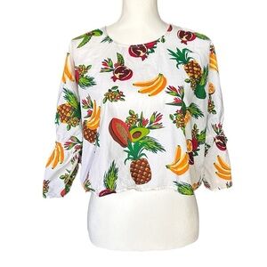 ZARA Collection Crop Top sz M White w/Fruit Cotton Sequins 3/4 Ruffle Sleeve