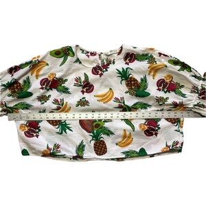 Embrace the vibrant essence of summer with this ZARA cropped blouse, a charming addition to your wardrobe that captures the spirit of tropical getaways and sunny afternoons. Featuring a playful tropical fruit pattern on a crisp white background, this top is a testament to laid-back elegance. Its 3/4 ruffle bell sleeves and round neck design offer a relaxed fit that's perfect for a range of occasions, from casual outings to cocktail parties. Crafted from breathable cotton, this multicolor blouse is both lightweight and durable, ensuring comfort with every wear.