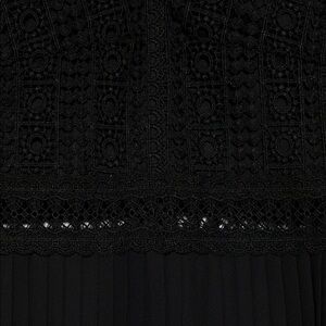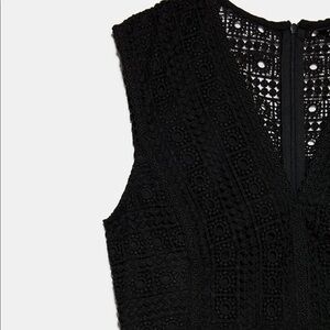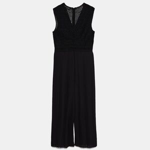 Sleeveless V-neck jumpsuit. Wide leg. Tonal matching lace guipure applique. Back hidden in-seam zip closure. 100% Polyester
