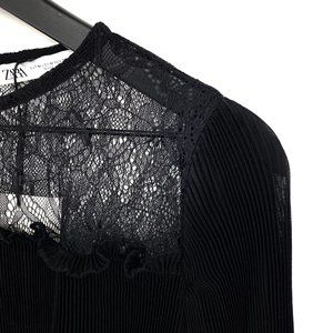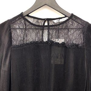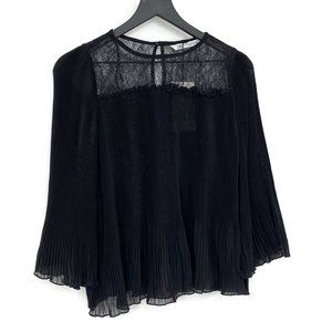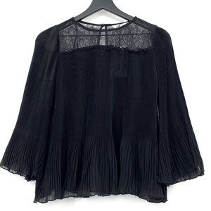 ZARA Combined Pleated Blouse NWT is an elegant mixed styles of both pleated and floral lace with a twist of vintage bell sleeves. This combined pleated blouse has a romantic appeal to be dressed with faux leather skirts or pants with high leg boots.