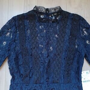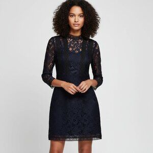 ZARA Contrasting Lace Sheath Dress in Navy & Black. NWT, Size S, raised collar, sheath silhouette, keyhole button in back. 100% polyester, lined. Originally $80.