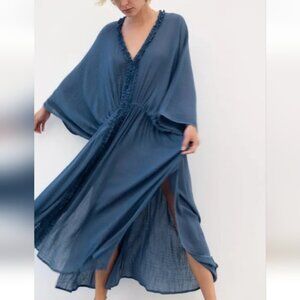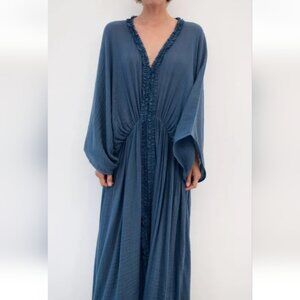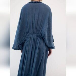 ZARA Cotton Kaftan Blue Dolman Sleeve Crinke Texture Oversize Ruffle