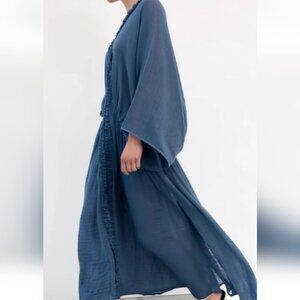 ZARA Cotton Kaftan Blue Dolman Sleeve Crinke Texture Oversize Ruffle Size Small