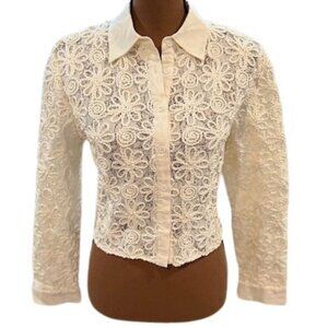 ZARA Crochet Knit Flowers Button-Down Cropped Collared Cardigan in Off-White – Size Medium - NWOT