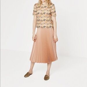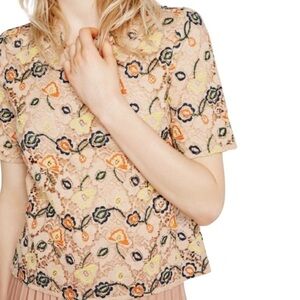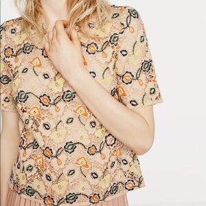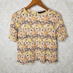Stylish Zara Sheer Lace Top in crocheted nude lace with orange and yellow accent. Single button at back of neck. In excellent pre-owned condition from pet-free/smoke-free home.