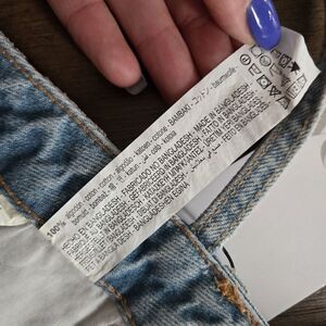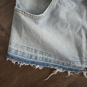 Jean top features 2 front pockets, button and zip closure, and a frayed or distressed bottom hem. Light wash.