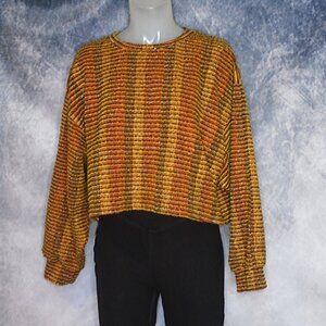 For me, This is the perfect fall sweater. The colors scream“autumn”! The metallic sparkle is multicolor! my problem is that it's too big for me so I'm passing it on. I admit it was a great thrift shop find so I'm going to pass the savings on to buyer. The fabric tag has been taken out but there's no wool in this most likely acrylic with metallic sparkle. Crew neck, wonderful balloon sleeves with small cuffs. This is boxy and oversized so please take that into consideration when you see the measurements. By the way there are no flaws in this it may be unused stock.