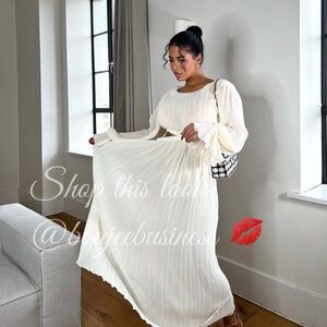 Round neck with long sleeves and elastic cuff. Side cut out at waist. Interior lining. Back hidden in-seam zip closure. Color: Ecru