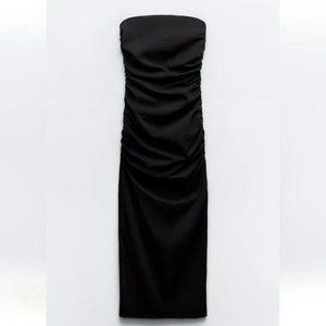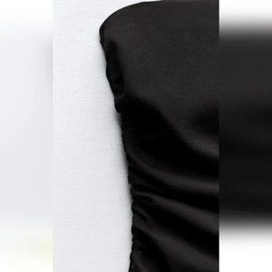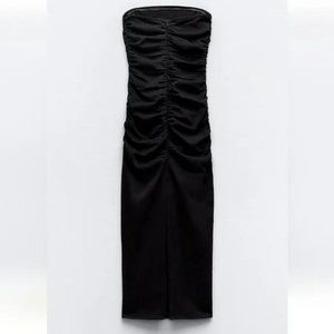 Straight neck dress with gathered sides. Back slit.Back hidden in-seam zip closure .