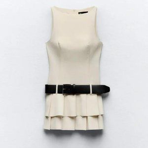 Round neck dress with matching semi-sheer fabric long sleeves. Ruching detail at sides. Asymmetric hem. Back hidden in-seam zip closure. Khaki