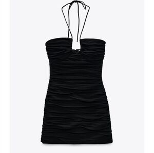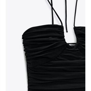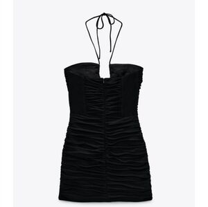 short dress with opening and hidden metal applique at front, adjustable thin straps with self tie, pleats and smocked elastic detail, hidden in-seam closure