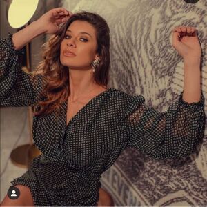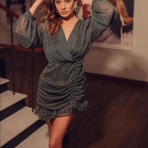 Mini dress with v neck wrap front and Long sleeves. Gathered hem with ruffles. Back hidden in seam zip closure with opening and button